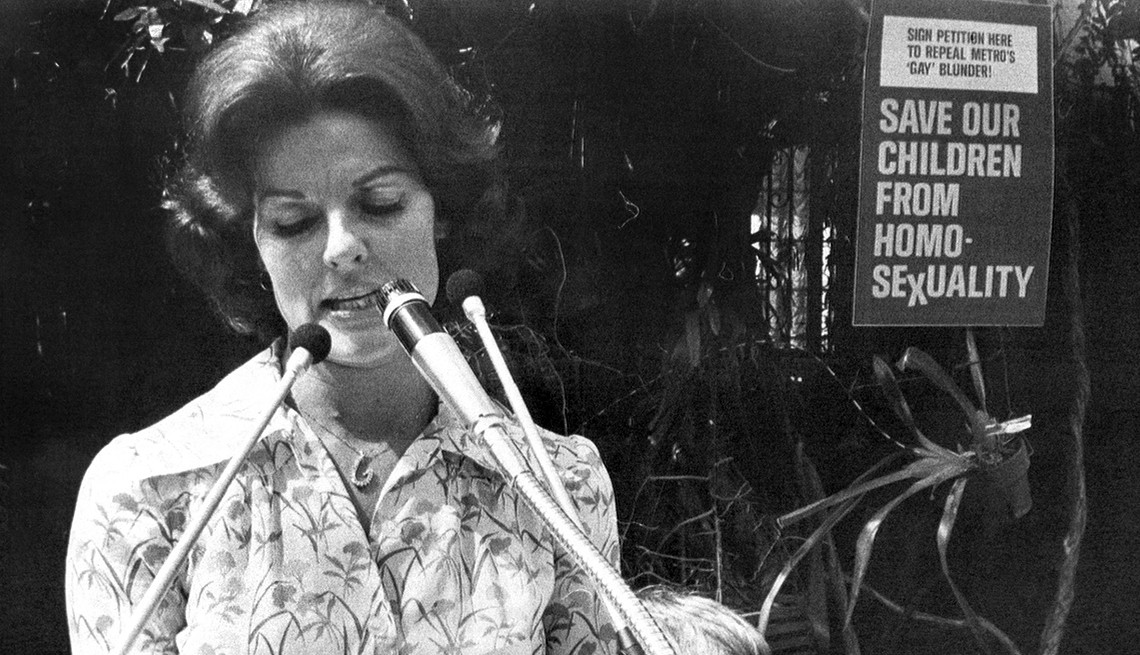 A referendum in Dade County Florida, forced by pressure from fundamentalist Xtian, Anita Bryant, husband Bob Green and their "Save Our Children" organization, and one of the first ballot measures of this type, repeals a county ordinance prohibiting discrimination on basis of sexual orientation. It was the first major battle -- and defeat -- in struggle for Gay Rights in United States. It was also the first successful use of "child molestation tactic" by anti- Gay forces and set the pattern of attack for remainder of Seventies and into Eighties.