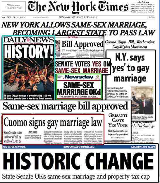 The State of New York passes a Marriage Equality bill approved by a margin of 33-29 that gave Gay and Lesbian couples the right to wed. The new law, which took effect a month later on July 24, made New York the largest state to allow same-sex marriage. New York State became the sixth in America to change its marriage law, joining countries including Canada, Sweden, Argentina, and even Catholic Spain. Following a segment on the New York marriage equality vote, radical religious idiot Pat Robertson warned that America is becoming Sodom and will suffer the same fate of destruction, according to Right Wing Watch.