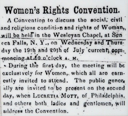 WOMEN’S RIGHTS: The first, two day Womens Rights Convention opens in Seneca Falls, New York and the "Bloomers" are introduced at the feminist convention. The convention was organized by Lucretia Mott and Elizabeth Cady Stanton. Over 300 women attended. A series of declarations were made by the assembled women. The issue of women's suffrage was met with serious opposition until Frederick Douglas convinced the conventioneers that they should pass a declaration demanding it.
