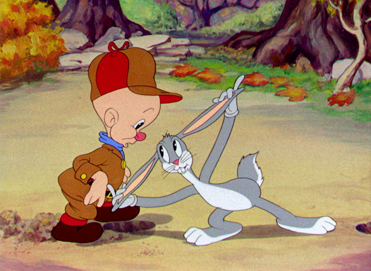 Bugs ends up floating in a raft through a log upon which Elmer jumps in, only to come out the other end of the log (“Tunnel of Love”) with Elmer hugging Bugs and Bugs replying in a feminine voice, “I bet you say that to all the women.”