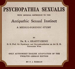RICHARD VON KRAFFT-EBING, German psychologist, born (d. 1902). His book Psychopathia Sexualis ("Psychopathy of Sex") became his best-known work. He wrote the book, intended as a forensic reference for doctors and judges, in high academic tone and in the introduction noted that he had "deliberately chosen a scientific term for the name of the book to discourage lay readers". In the first edition in 1886, Krafft-Ebing divided sexual deviance into four categories: paradoxia, sexual desire at the wrong time of life, i.e. childhood or old age; anesthesia, insufficient desire; hyperesthesia, excessive desire; paraesthesia, sexual desire for the wrong goal or object. This included homosexuality (or "contrary sexual desire"), sexual fetishism, sadism, masochism, pederasty and so on.