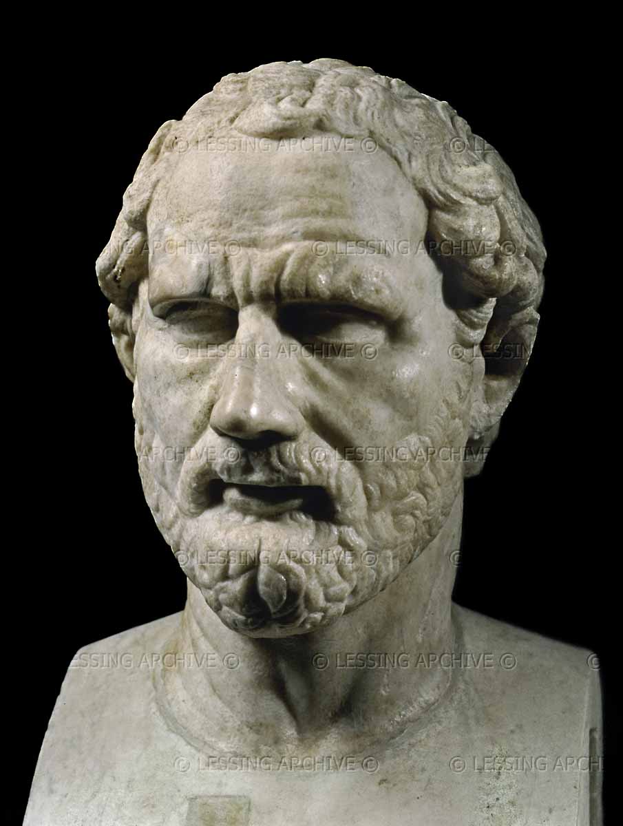 DEMOSTHENES is born in Athens. Anyone who has struggled with public speaking knows the parable about putting pebbles in your mouth. It was Demosthenes who invented the practice. When he wasn't practicing with pebbles he was dating the young men of the city. His father, a rich manufacturer of swords and other arms, died when Demosthenes was seven. The guardians of his father’s estate handled it dishonestly, and at eighteen Demosthenes demanded his rightful inheritance. After studying with Isaeus, an orator and specialist in law, Demosthenes brought charges against his guardians and finally won his case, but actually received little of what was due him. To earn a living, Demosthenes became a professional writer of speeches.