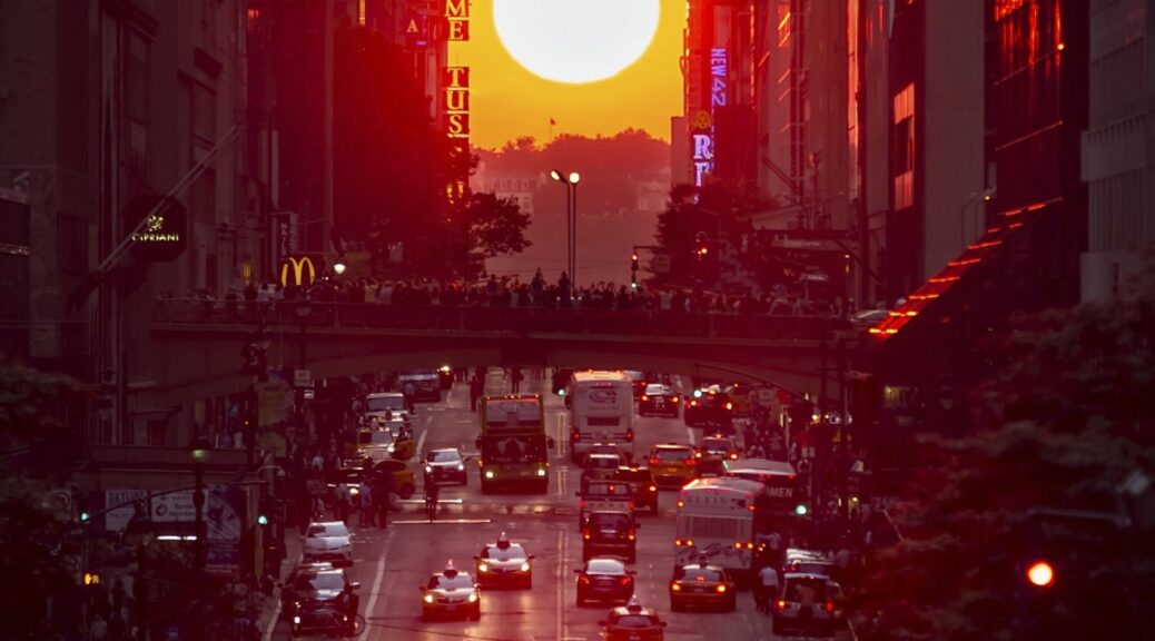 MANHATTANHENGE (also called “Manhattan Solstice”) is a phenomenon during which the setting sun aligns perfectly with Manhattan’s street grid, allowing the sunlight to beam through the East-West streets. The spectacle can be witnessed twice a year.